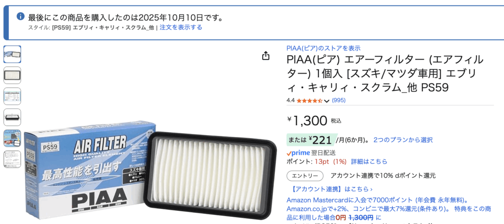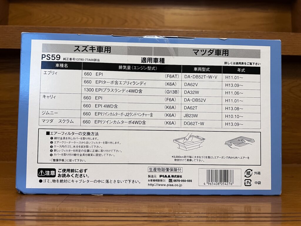 Amazonで「PIAA エアーフィルター PS59」を購入しました。