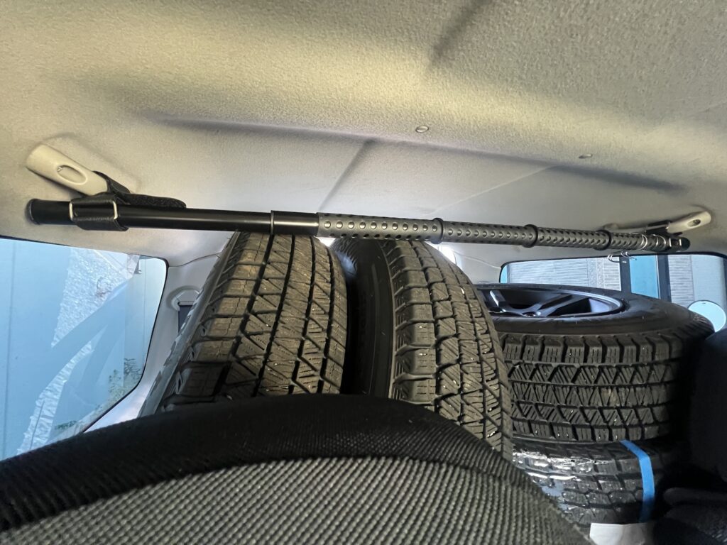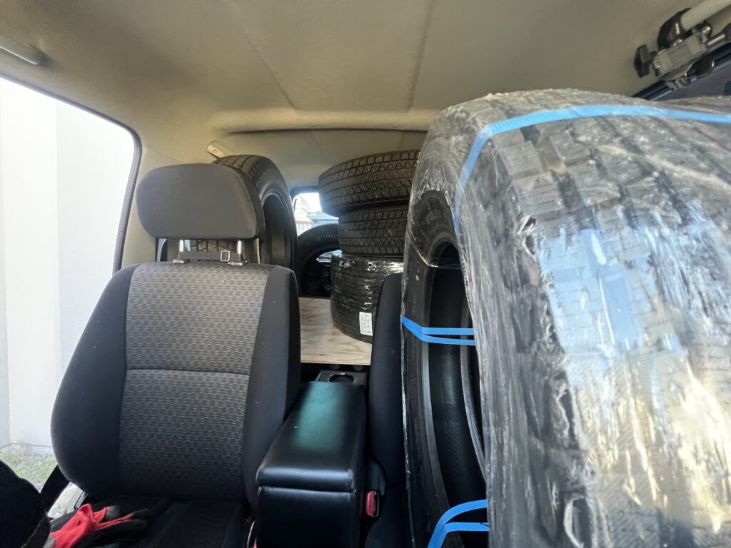 交換当日は、ジムニーの小さな車内に、去年まで使っていたホイール付き冬タイヤ4本と、新品の G075 タイヤ(ホイール無し)を合計8本、ギチギチに詰め込みました。